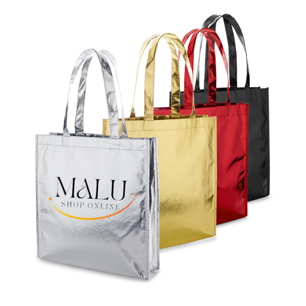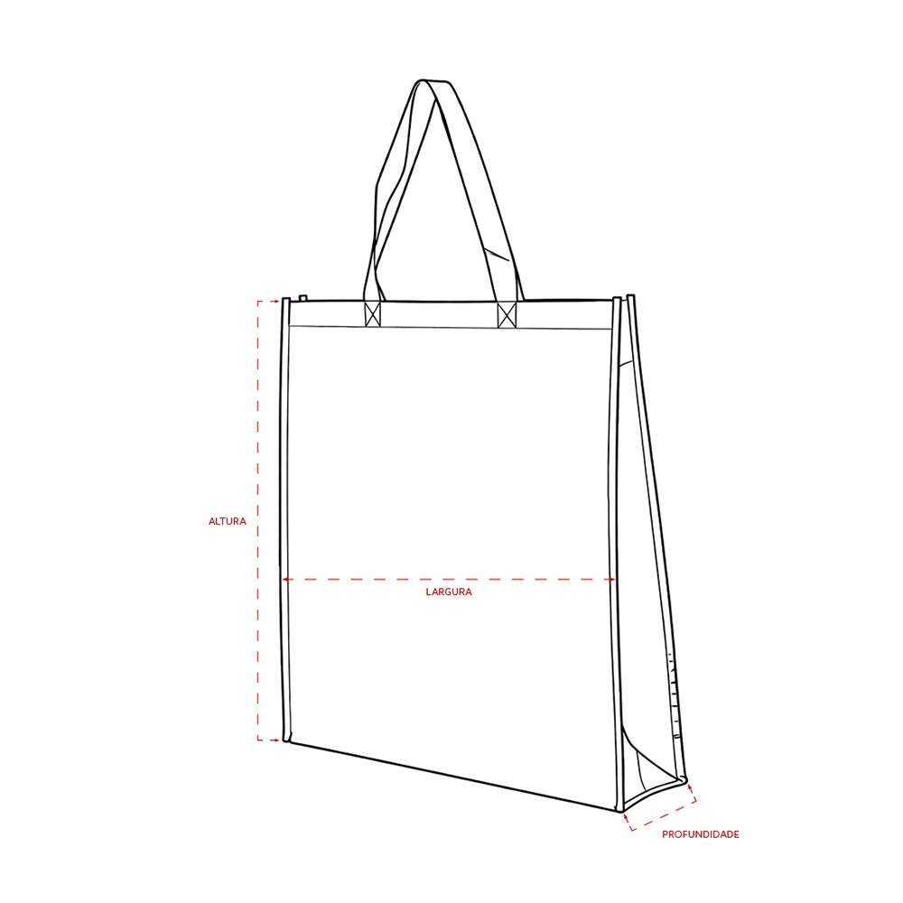 Descrição: Sacola em TNT com revestimento externo laminado e duas alças costuradas.